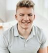 A dimly lit laundromat with a row of washing machines lining the right side. Laundry carts are visible along the left, and the tile floor reflects the subdued lighting from overhead. Various cleaning supplies sit on top of the machines.
